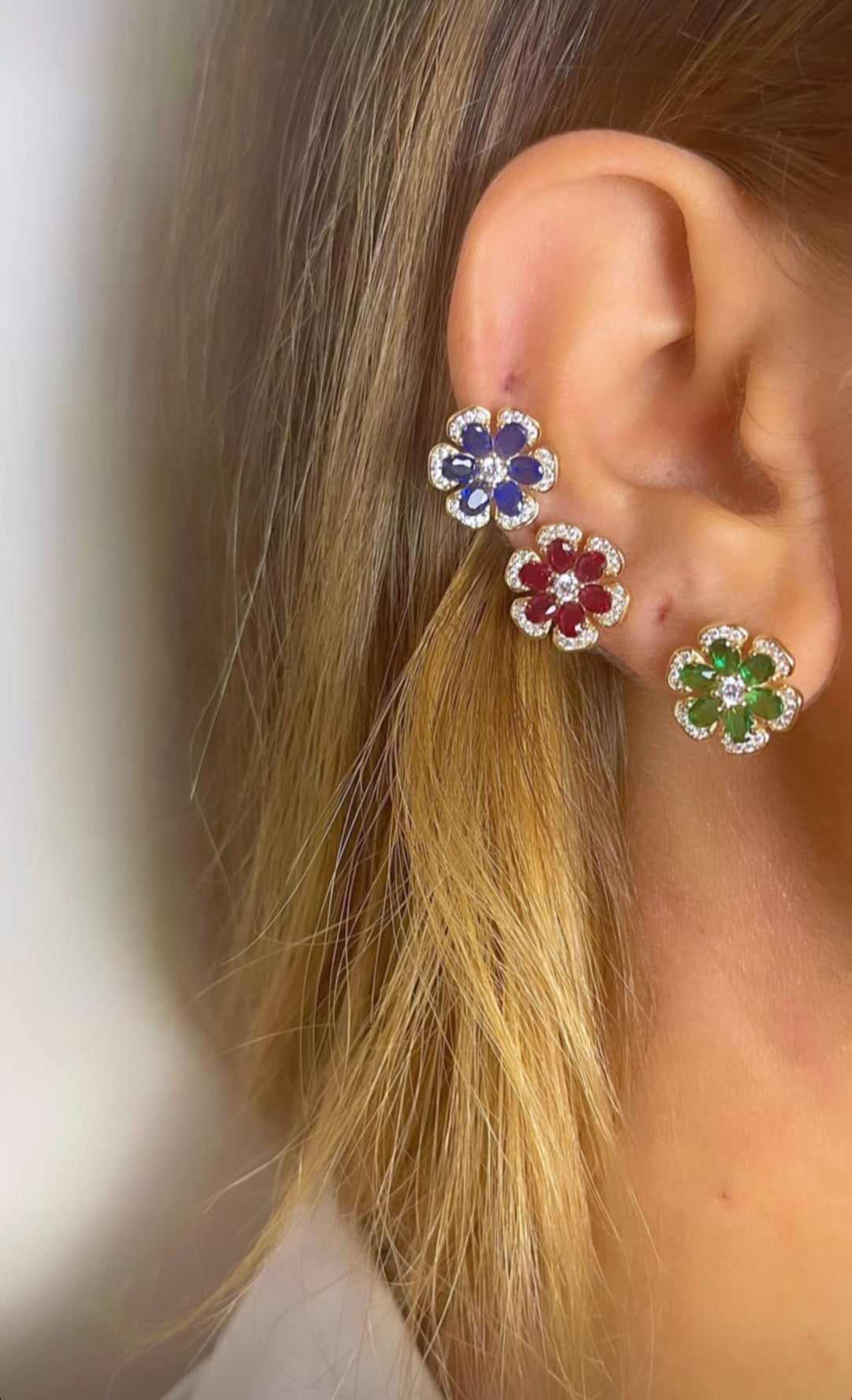 Orecchini a forma di camelia con pietre colorate e punti luce bianchi